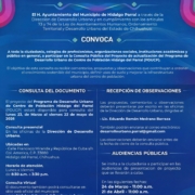 Como parte del proceso participativo, se invita a la ciudadanía a asistir a las audiencias de presentación del proyecto, que se llevarán a cabo los días 24 de marzo y 21 de abril, a las 11:00 horas, en el Auditorio 1 del DIF Municipal, espacios destinados para conocer a detalle la propuesta y fomentar el diálogo abierto.