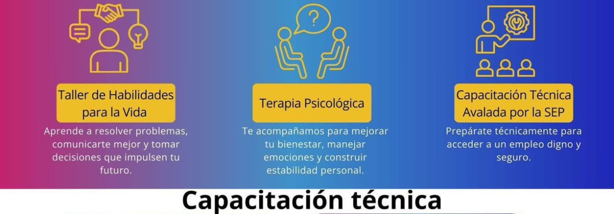 El programa está diseñado para personas de entre 18 y 35 años y combina tres componentes fundamentales: taller de habilidades para la vida, terapia psicológica y capacitación técnica. Las trayectorias incluyen Mantenimiento Industrial con especialidad en soldadura e hidráulica diésel, así como Ofimática con enfoque en atención al cliente.