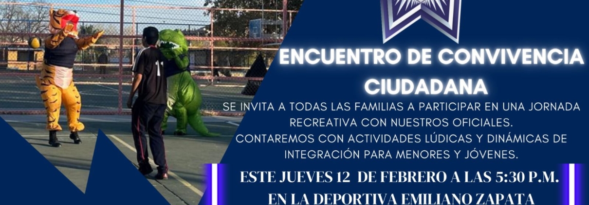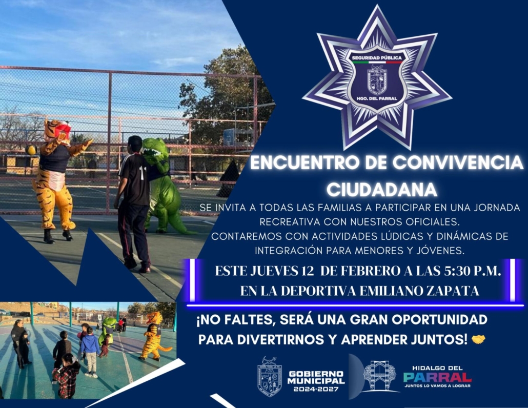 Con el objetivo de fortalecer la confianza ciudadana, fomentar la proximidad social y generar un espacio de esparcimiento seguro para las familias, el Gobierno Municipal, a través de la Dirección de Seguridad Pública Municipal, invita a la comunidad parralense a participar en la Gran Convivencia Familiar que se llevará a cabo este jueves 12 de febrero, a las 5:30 p.m., en la Deportiva Emiliano Zapata.