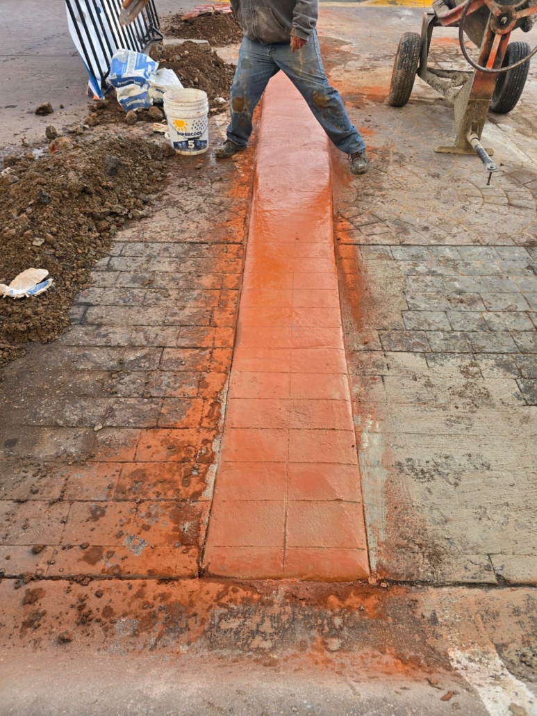 Para preservar la estética del centro histórico, la reparación incluyó un acabado con estampado y color integrados, logrando armonía con el entorno de la Plazuela Morelos.