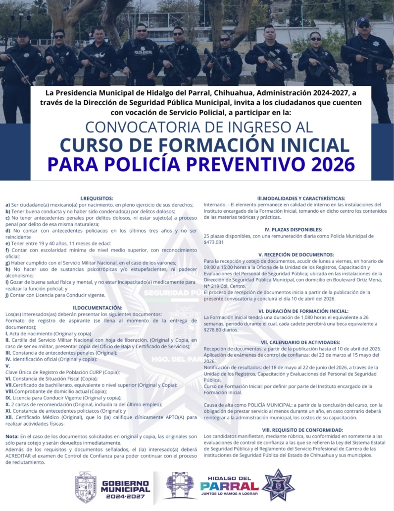 La Presidencia Municipal de Hidalgo del Parral, a través de la Dirección de Seguridad Pública Municipal (DSPM), convoca a mujeres y hombres con vocación de servicio a integrarse a la Policía Municipal de Proximidad 2026, sumándose a un modelo de seguridad cercano a la ciudadanía y enfocado en la construcción de paz.
