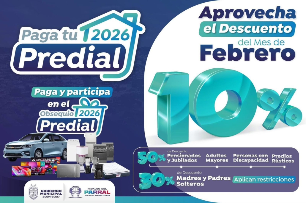El Gobierno de Parral invita a la ciudadanía a aprovechar los últimos días del 10 por ciento de descuento en el pago del Impuesto Predial, como parte de las acciones implementadas para apoyar la economía de las familias parralenses y fomentar el cumplimiento oportuno de sus contribuciones.