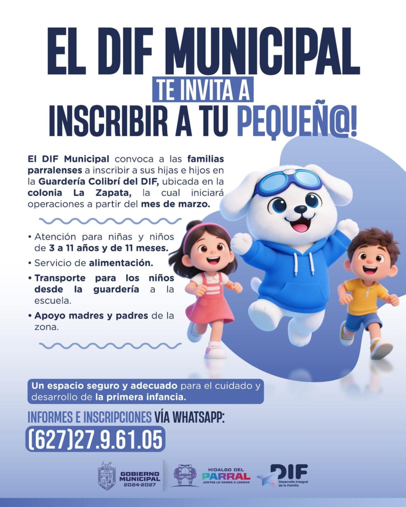 El Gobierno de Parral, a través del Desarrollo Integral de la Familia (DIF) Municipal, abrió la convocatoria para que madres trabajadoras integren a sus hijas e hijos a la nueva guardería municipal, un proyecto prioritario impulsado por el alcalde Salvador Calderón. Este espacio brindará atención a niñas y niños desde los 3 meses hasta los 11 años, fortaleciendo el respaldo institucional a las familias parralenses.