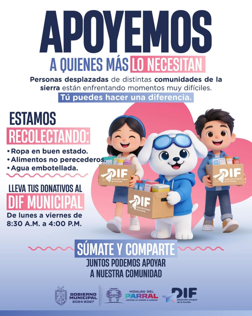 Los donativos serán recibidos de lunes a viernes, en un horario de 8:30 de la mañana a 4:00 de la tarde, en las instalaciones del DIF Municipal. El Gobierno de Parral hace un llamado a la solidaridad de las y los parralenses para continuar demostrando que, en los momentos difíciles, la unión y el compromiso social marcan la diferencia.