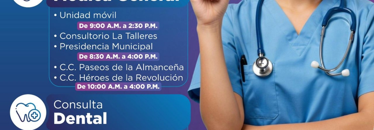 Como parte de esta estrategia, se brinda atención en el consultorio de la colonia Talleres y en Presidencia Municipal en un horario de 8:30 de la mañana a 4:00 de la tarde. Asimismo, el consultorio ubicado en las colonias Paseos de Almanceña y Héroes de la Revolución ofrece servicio de 10:00 de la mañana a 4:00 de la tarde.