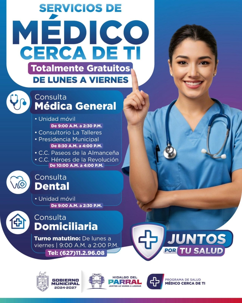 El Gobierno de Parral, a través del programa Médico Cerca de Ti, pone a disposición de la ciudadanía servicios de consulta médica general, atención dental y consulta domiciliaria, brindados por personal especializado de lunes a viernes. Esta estrategia busca acercar servicios de salud de calidad a quienes más lo necesitan.