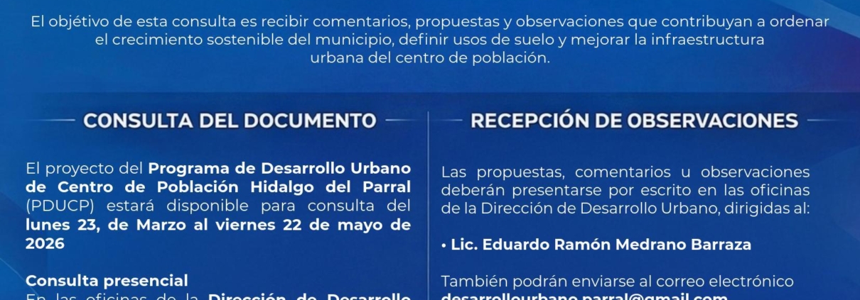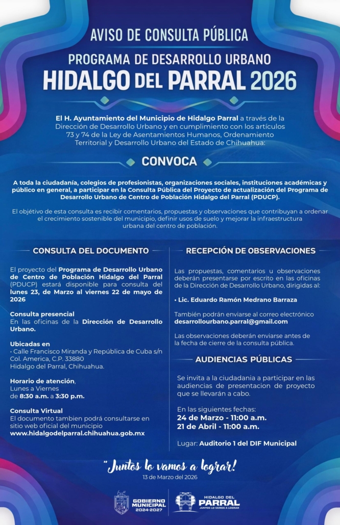El Gobierno de Hidalgo del Parral invita a toda la ciudadanía a participar en la Consulta Pública del Programa de Desarrollo Urbano Hidalgo del Parral 2026