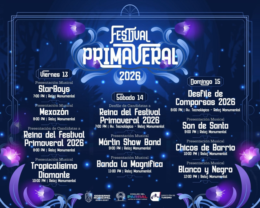 El Gobierno Municipal de Parral, encabezado por el alcalde Salvador Calderón Aguirre, a través de la Dirección de Turismo, invita a la ciudadanía y visitantes a disfrutar del arranque del Festival Primaveral 2026, una celebración pensada para convivir en familia y fortalecer la vida cultural de la ciudad.
