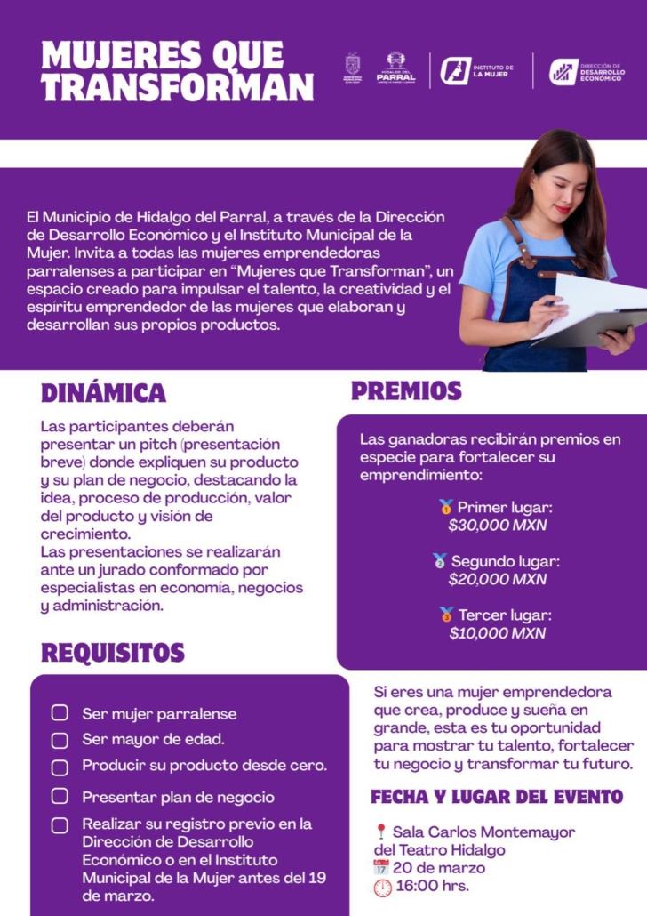 El Gobierno de Parral, encabezado por el alcalde Salvador Calderón, a través de la Dirección de Desarrollo Económico y el Instituto de la Mujer, convoca a mujeres emprendedoras del municipio a participar en el programa “Mujeres que Transforman”, iniciativa orientada a impulsar el talento, la creatividad y el desarrollo empresarial femenino.
