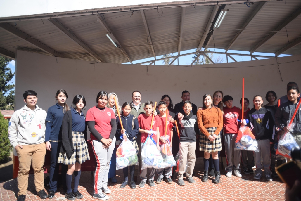 Como parte de su visita entregó apoyos deportivos entre los que se incluyo balones, y diversos artículos para la actividad física.