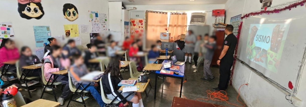 Por iniciativa del alcalde Salvador Calderón, los elementos de Protección Civil y Bomberos llevó a cabo una capacitación sobre fenómenos naturales a alumnos de la escuela primaria Insurgentes 2128, con la intención de informar sobre las acciones que pueden establecer para una pronta respuesta ante una situación de riesgo.