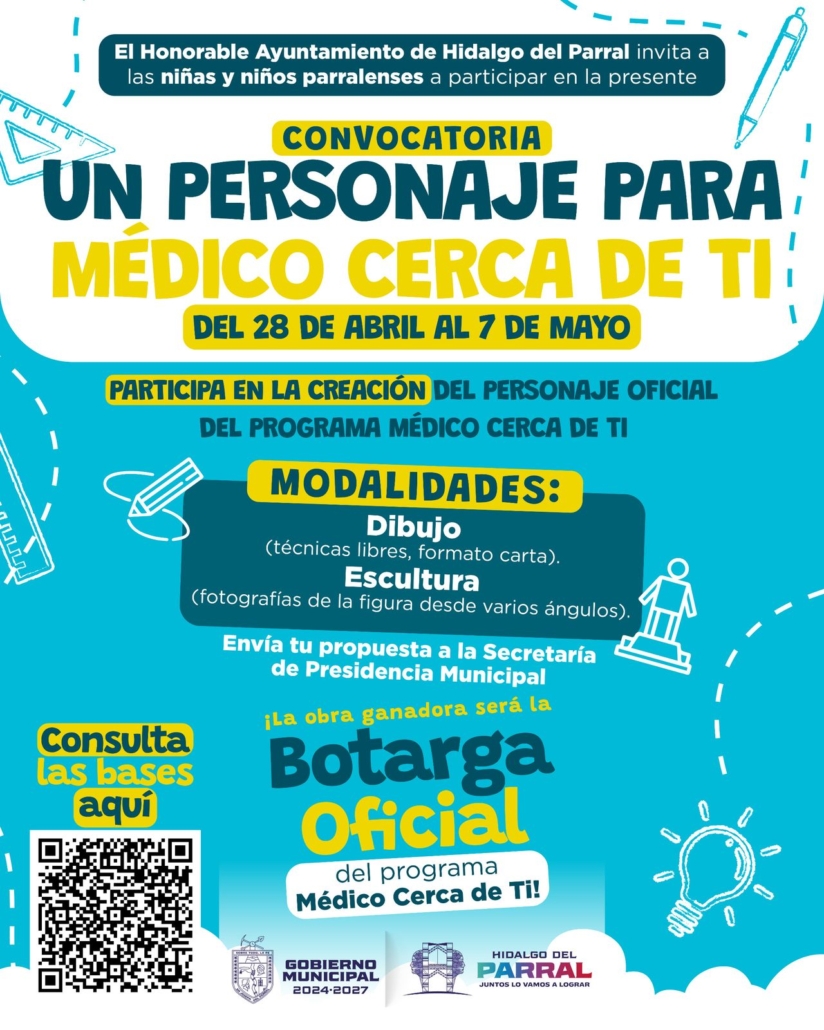 El Gobierno Municipal de Hidalgo del Parral, encabezado por el alcalde Salvador Calderón, invita a niñas y niños menores de 12 años a participar en la convocatoria para diseñar el personaje oficial del programa “Médico Cerca de Ti”, con el propósito de fortalecer su identidad en las diversas actividades que promueven el acceso a los servicios de salud.