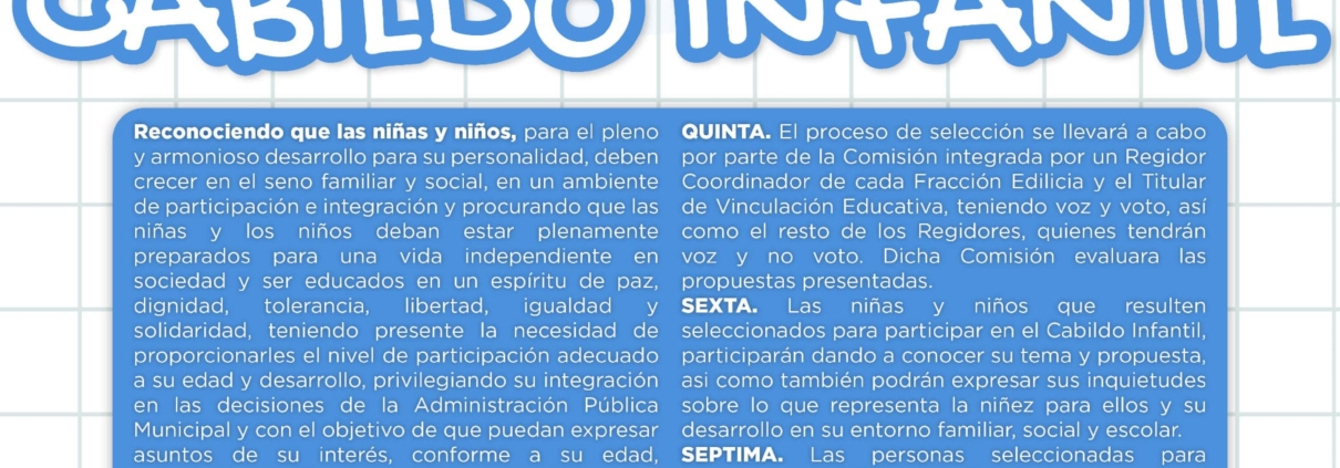 El Gobierno de Parral, a través del H. Ayuntamiento, convoca a niñas y niños de nivel primaria a participar en el Cabildo Infantil 2025, con el objetivo de fomentar su participación activa en temas de interés público y promover el ejercicio pleno de sus derechos en espacios de diálogo y expresión.
