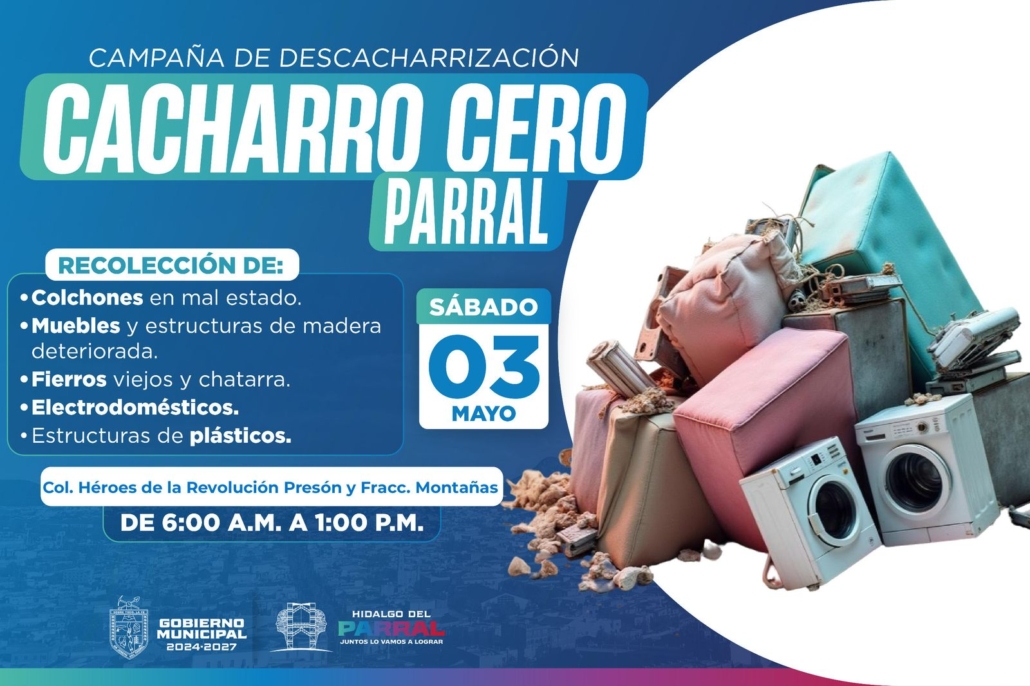 El Gobierno de Parral, a través de la Dirección de Servicios Públicos, informa que este sábado 3 de mayo se llevará a cabo la campaña “Cacharro Cero Parral” en la colonia El Presón y el Fraccionamiento Montañas, con el objetivo de fortalecer las acciones de limpieza y control sanitario en estos sectores.