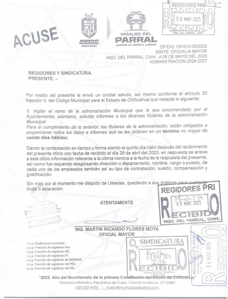 En un ejercicio de transparencia y legalidad, el Gobierno de Hidalgo del Parral, encabezado por el alcalde Salvador Calderón, dio respuesta oportuna a la solicitud formal presentada por regidores y la sindicatura municipal, entregando la información correspondiente a la nómina del personal que labora en la administración pública.