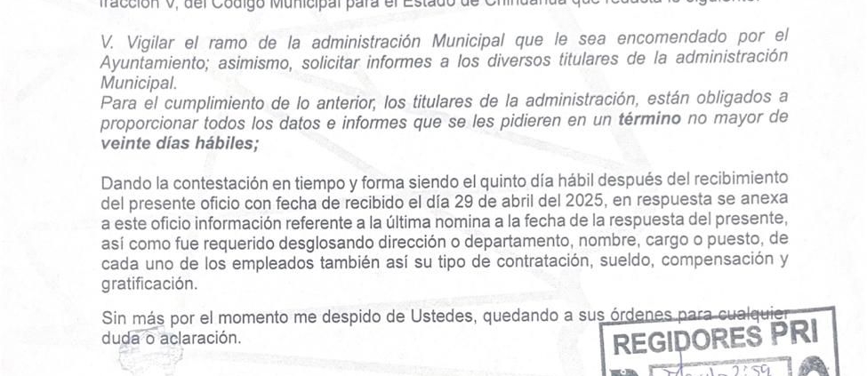 La petición fue recibida el 29 de abril de 2025, y de acuerdo con lo establecido en el artículo 33, fracción V, del Código Municipal para el Estado de Chihuahua, la Oficialía Mayor procedió con la entrega del documento dentro del plazo legal, siendo el caso, que el informe se entregó en el día 5 de los veinte días hábiles.