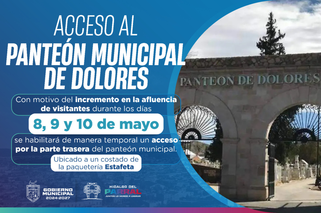 Con motivo del incremento en la afluencia de visitantes al Panteón Municipal de Dolores, el Gobierno de Parral, a través de la Dirección de Servicios Públicos, implementará un acceso peatonal adicional con el objetivo de facilitar el ingreso de las personas que acudirán a este espacio en los próximos dÃas.