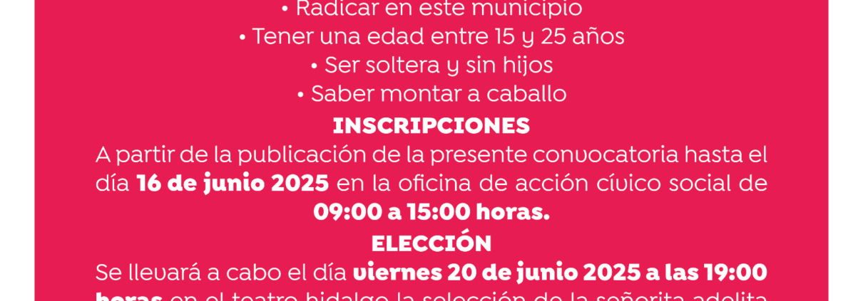 Las interesadas deben tener entre 15 y 25 años, ser solteras, no tener hijos, saber montar a caballo y residir en el municipio de Hidalgo del Parral. El registro estará abierto hasta el 16 de junio de 2025, en las oficinas del Departamento de Acción Cívico Social, ubicadas dentro de Presidencia Municipal, en un horario de 9:00 de la mañana a 3:00 de la tarde.