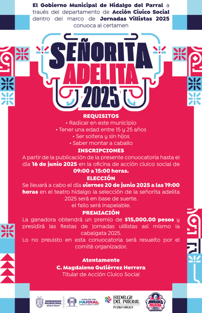Como parte de las celebraciones de las Jornadas Villistas 2025, el Gobierno de Parral, a través del Departamento de Acción Cívico Social, convoca a las jóvenes parralenses a participar en el tradicional certamen “Señorita Adelita 2025”.