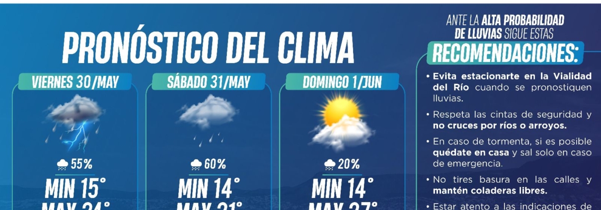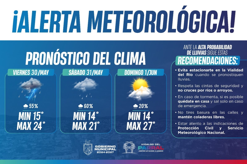 El Gobierno de Parral, a través de la Coordinación Municipal de Protección Civil, informa a la población sobre la probabilidad de lluvias para este fin de semana. De acuerdo con los pronósticos, existe una posibilidad del 55% para el día de hoy, así como 60% y 20% durante el fin de semana.