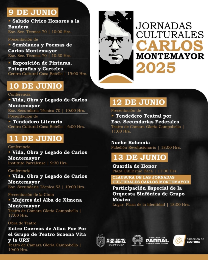 Este lunes por la noche darán inicio las Jornadas Culturales Carlos Montemayor, un evento promovido por el Gobierno de Parral con el objetivo de rendir tributo a uno de los escritores más emblemáticos nacidos en esta tierra. La ceremonia inaugural se celebrará en el Centro Cultural Casa Botello, con una Exposición de Pinturas, Fotografías y Carteles, programada a partir de las 19:00 horas.