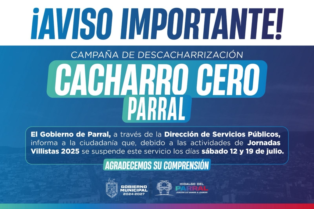 El Gobierno de Parral informa a la población que el programa “Cacharro Cero” se suspenderá de manera temporal durante los sábados 12 y 19 de julio, en atención a la agenda de actividades contempladas dentro de las Jornadas Villistas 2025.