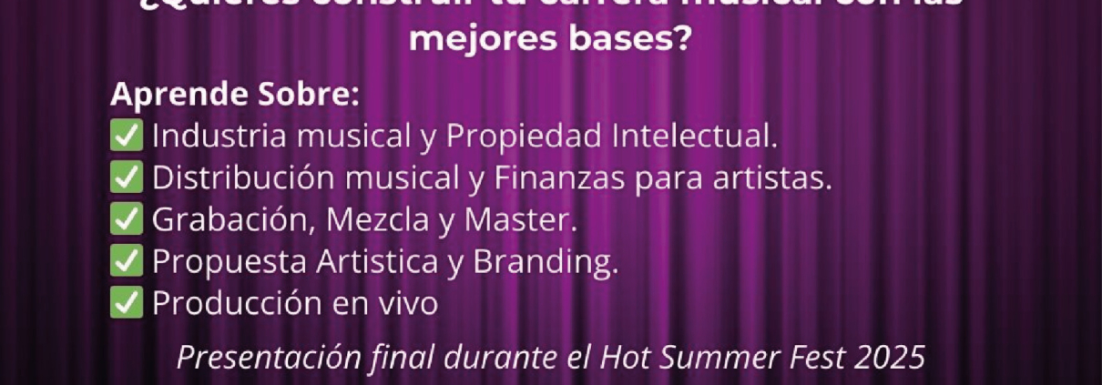 Como parte del cierre del taller, las y los participantes tendrán la oportunidad de presentar su proyecto en el escenario del Hot Summer Fest 2025, una plataforma importante para dar a conocer su propuesta ante el público local y regional.