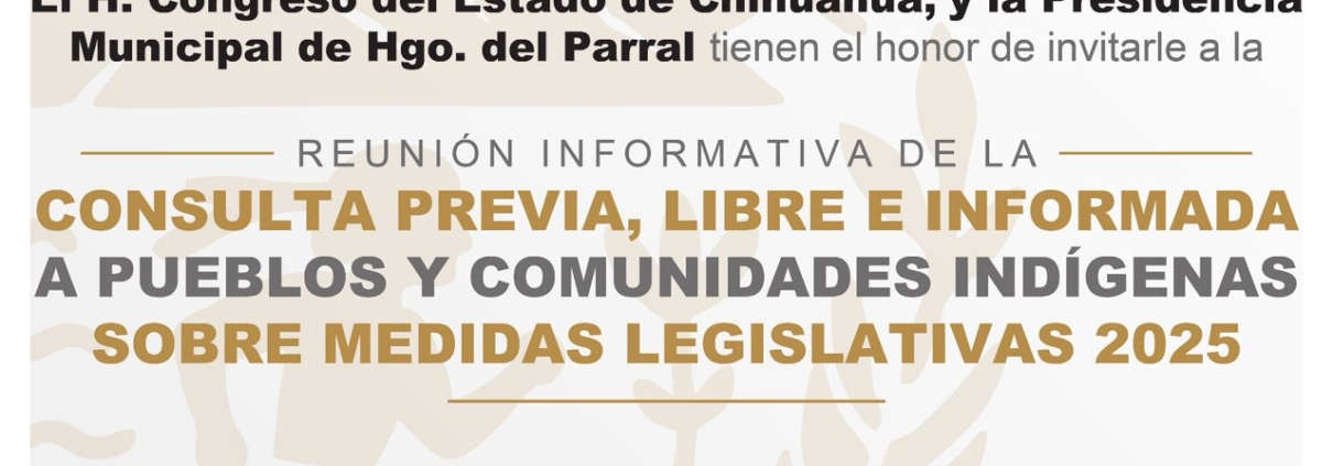 El Gobierno de Parral, en coordinación con el Honorable Congreso del Estado de Chihuahua, convoca a la Consulta Previa, Libre e Informada a Pueblos y Comunidades Indígenas sobre Medidas Legislativas 2025, un ejercicio de participación que busca garantizar que las voces de los pueblos originarios y comunidades indígenas del Estado de Chihuahua sean escuchadas, respetadas e incorporadas en el proceso legislativo.