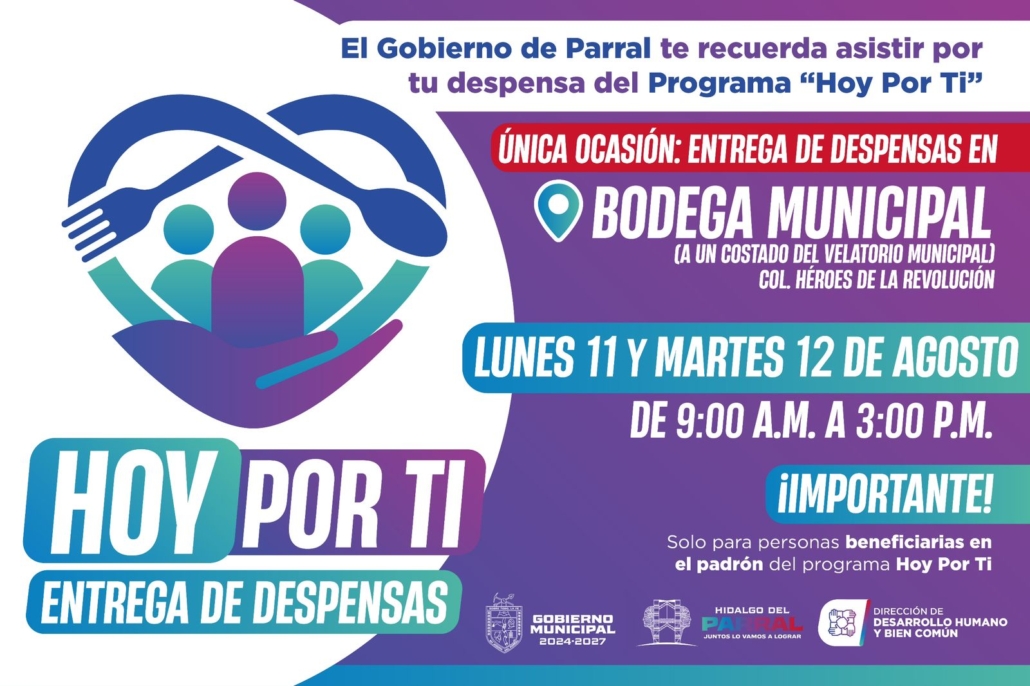 El Gobierno de Parral, encabezado por el alcalde Salvador Calderón, a través de la Dirección de Desarrollo Humano y Bien Común, informa que los días lunes 11 y martes 12 de agosto se llevará a cabo la entrega oficial de despensas correspondientes al programa social “Hoy Por Ti”, destinado a respaldar a las familias que más lo requieren en la ciudad.