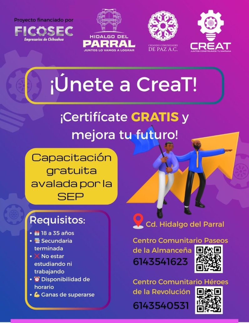 Con el respaldo del Gobierno de Parral 2024–2027 y en coordinación con Creando Comunidades de Paz A.C., FICOSEC y el Instituto Municipal de la Juventud (IMJUVE), se anunció la apertura de la convocatoria del Proyecto “Crea-T Parral”, dirigida a jóvenes de entre 18 y 35 años que actualmente no estudien ni trabajen y que cuenten con al menos la secundaria concluida.