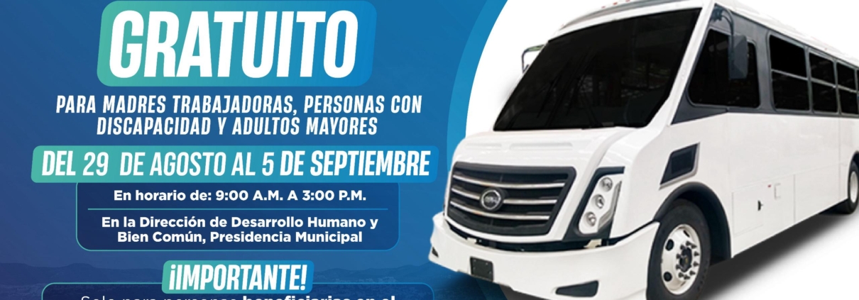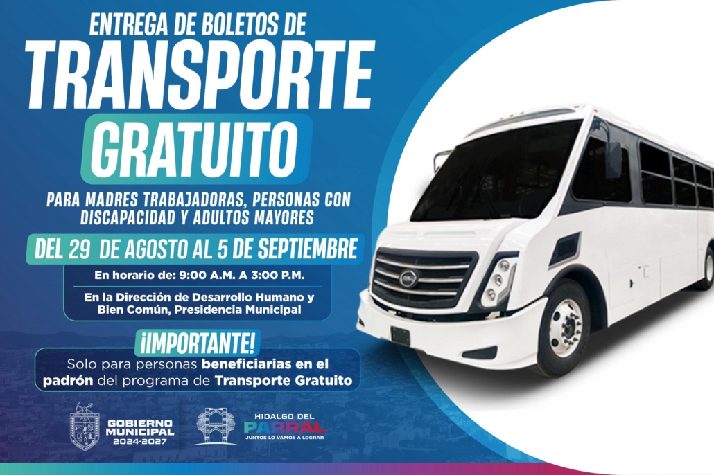 El Gobierno de Parral, encabezado por Salvador Calderón Aguirre, informa que del 29 de agosto al 5 de septiembre se llevará a cabo la entrega de boletos del programa de transporte gratuito, dirigido a los beneficiarios que ya forman parte del padrón oficial.