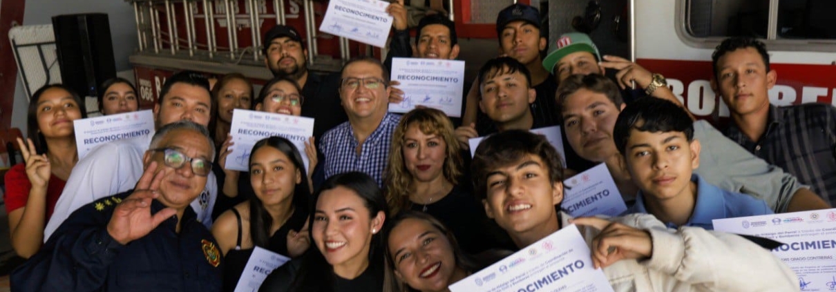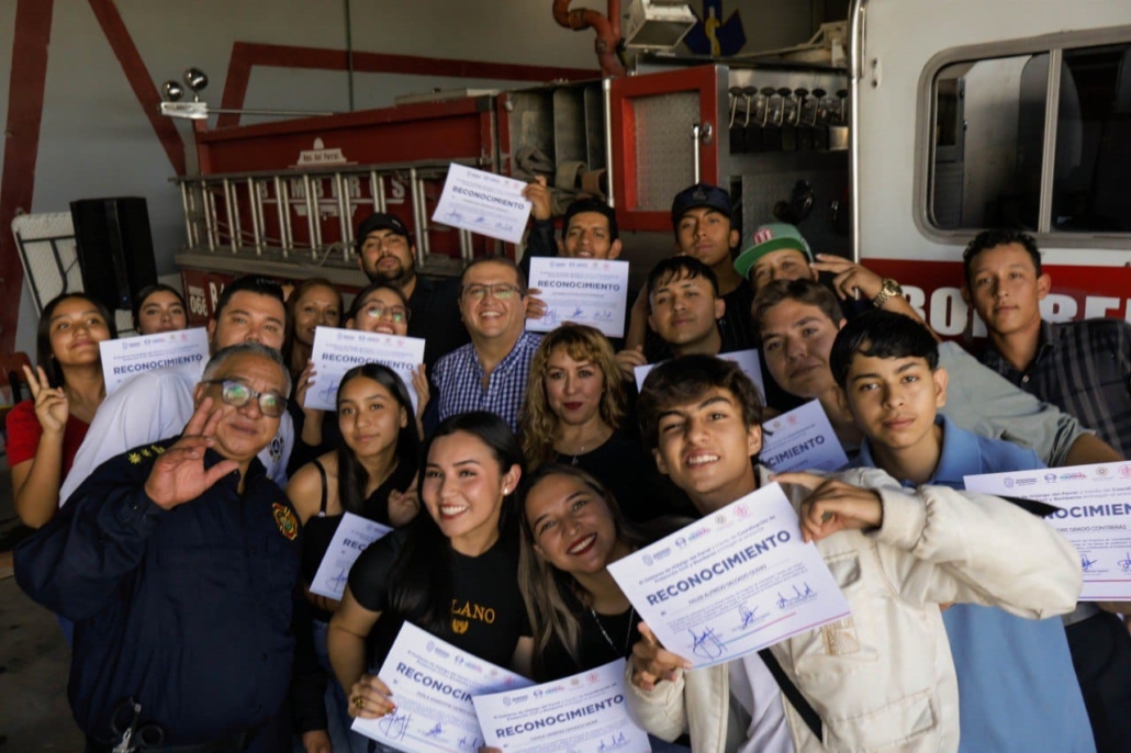 El presidente municipal Salvador Calderón Aguirre encabezó la ceremonia de entrega de constancias, acompañado por el Comandante de Bomberos Pedro Rodríguez, la Coordinadora del Grupo de Voluntariado Karen Soto y el Coordinador de Protección Civil Raymundo Prieto, además de funcionarios municipales y familiares que celebraron junto a los jóvenes este importante logro.