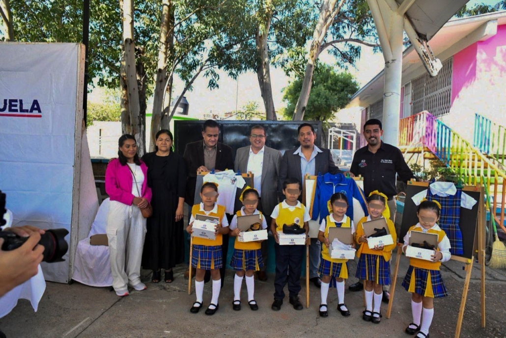 El presidente municipal Salvador Calderón realizó la entrega de uniformes y calzado escolar en el Jardín de Niños Gabriela Mistral, beneficiando directamente a 65 hogares que verán reducido este importante gasto económico en este ciclo escolar.
