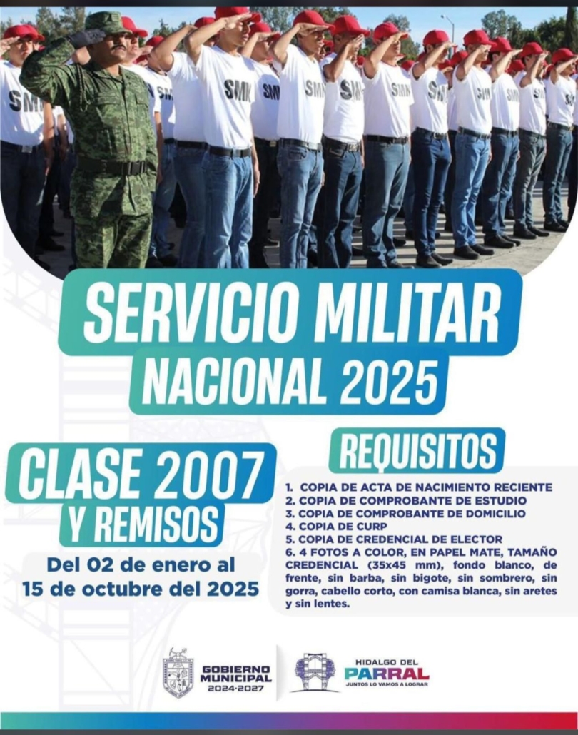 El Gobierno de Parral, encabezado por el alcalde Salvador Calderón Aguirre, hace un llamado a los jóvenes de la ciudad a realizar su trámite de alistamiento para el Servicio Militar Nacional (SMN), correspondiente a la Clase 2007 y Remisos, el cual concluye el próximo 15 de octubre.