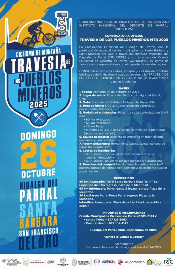 Con el firme compromiso de impulsar el deporte y fortalecer la convivencia entre municipios vecinos, el Gobierno de Parral, en coordinación con Santa Bárbara y San Francisco del Oro, convoca a la gran “Travesía de los Pueblos Mineros MTB 2025”, un evento ciclista de montaña que se llevará a cabo el domingo 26 de octubre.