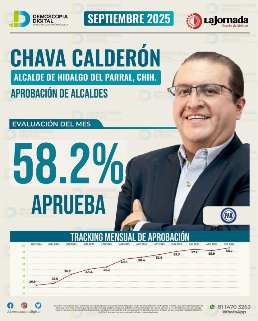 De acuerdo con la más reciente medición de Demoscopia Digital, el presidente municipal de Hidalgo del Parral, Salvador Calderón Aguirre, se consolida entre los tres alcaldes mejor evaluados de Chihuahua, al registrar una aprobación ciudadana del 58.2%, reflejo del respaldo a la gestión que encabeza desde el inicio de la administración 2024-2027.