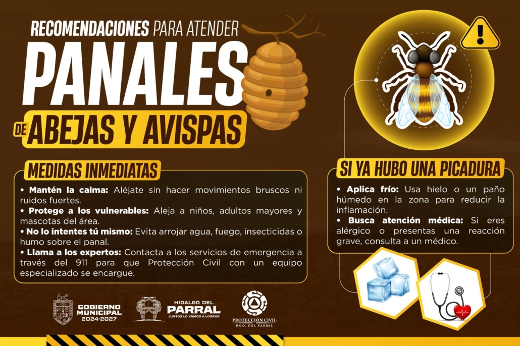 Con el objetivo de proteger la integridad de las familias y prevenir posibles accidentes, el Gobierno de Parral, a través de la Coordinación Municipal de Protección Civil, emitió una serie de recomendaciones para actuar de manera adecuada en caso de detectar panales de abejas o avispas en casas, escuelas o espacios públicos.