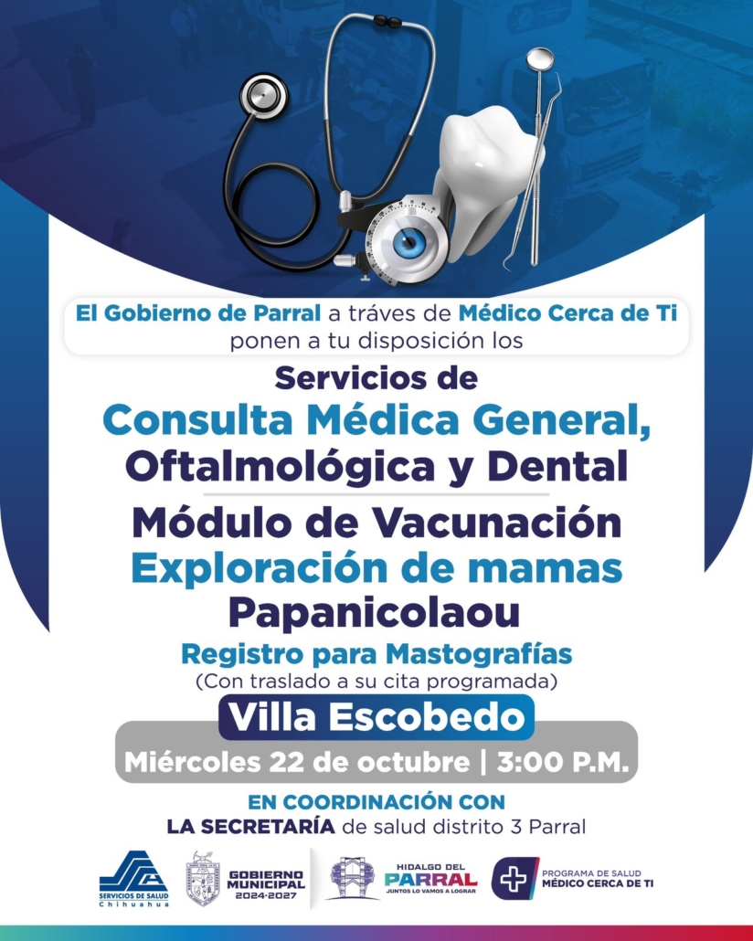 El Gobierno de Parral anuncia una jornada integral de servicios médicos y preventivos a través del programa “Médico Cerca de Ti” en coordinación con la Secretaría de Salud del Distrito 3, con el objetivo de acercar la atención especializada directamente a la comunidad de Villa Escobedo.