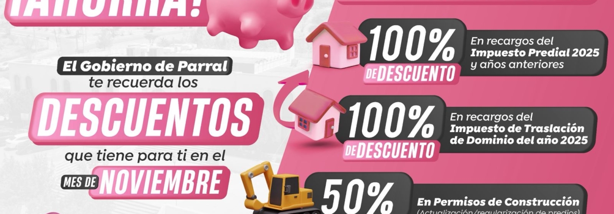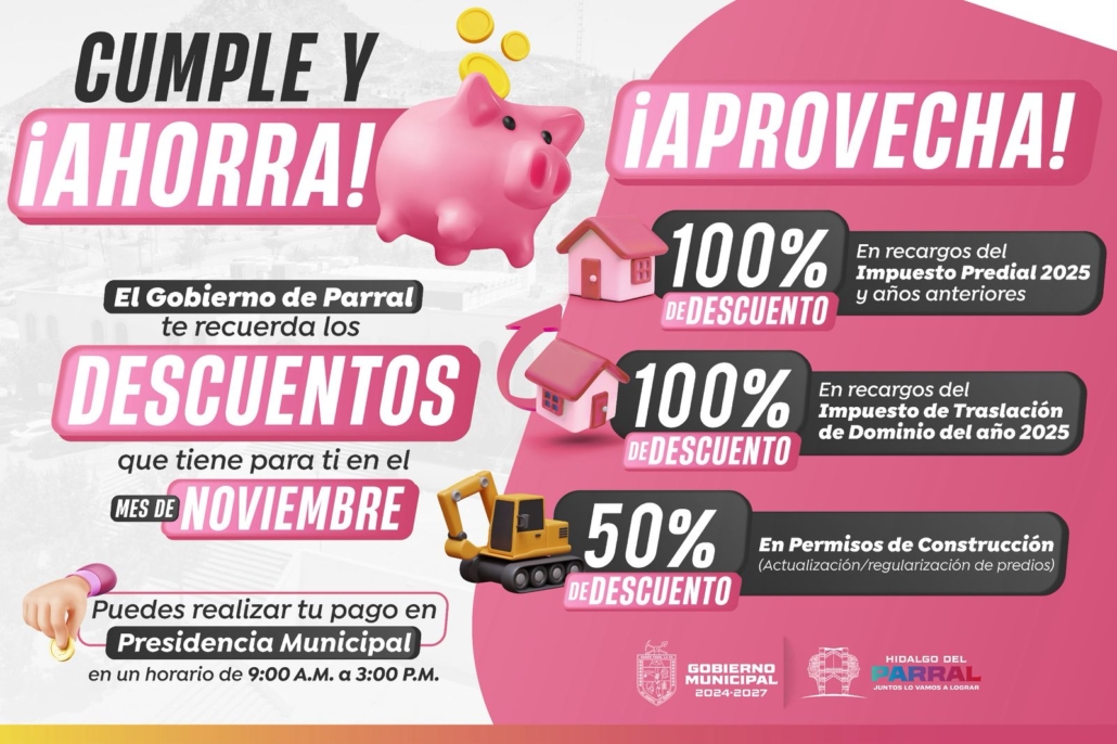 El Gobierno de Parral, encabezado por el alcalde Salvador Calderón, anunció la implementación de descuentos especiales durante el mes de noviembre, como una medida de apoyo a la economía de las familias parralenses y con el objetivo de facilitar el cumplimiento de sus contribuciones municipales.
