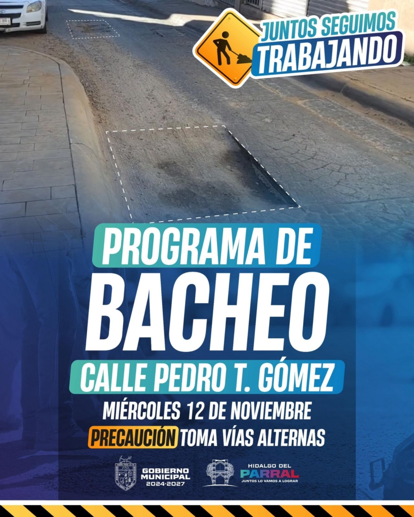 El Gobierno de Parral informa a la población que este miércoles 12 de noviembre se llevará a cabo una jornada de reparación de baches en la calle Pedro T. Gómez, ubicada en la zona centro de la ciudad. La acción forma parte de los trabajos permanentes de mantenimiento urbano que buscan mejorar la movilidad y seguridad vial.