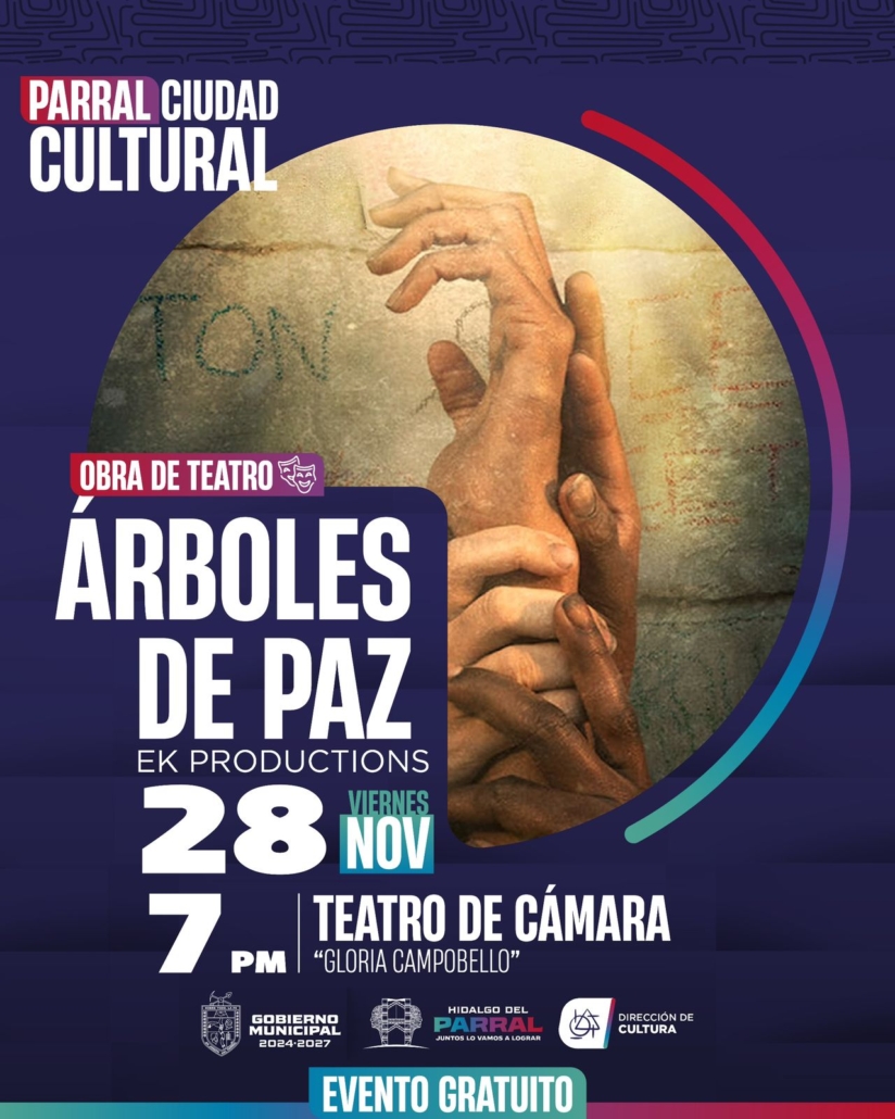 El Gobierno de Parral, a través de la Dirección de Cultura, invita cordialmente a toda la ciudadanía a disfrutar de la aclamada obra de teatro “Árboles de Paz”, presentada por EK Productions. Este evento forma parte de los esfuerzos permanentes por acercar actividades artísticas y culturales a la comunidad, promoviendo espacios que fomenten la reflexión, el entretenimiento y la convivencia familiar.