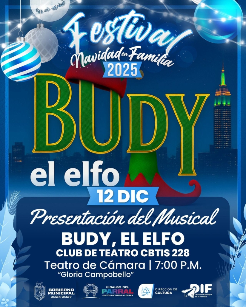 El Gobierno de Parral, a través de la Dirección de Cultura, invita a todas y todos los parralenses a disfrutar del musical navideño “Budy el elfo”, una producción que refleja el trabajo conjunto entre la administración municipal y el talento juvenil de nuestra ciudad, todo ello en el marco del Festival Navidad en Familia 2025.