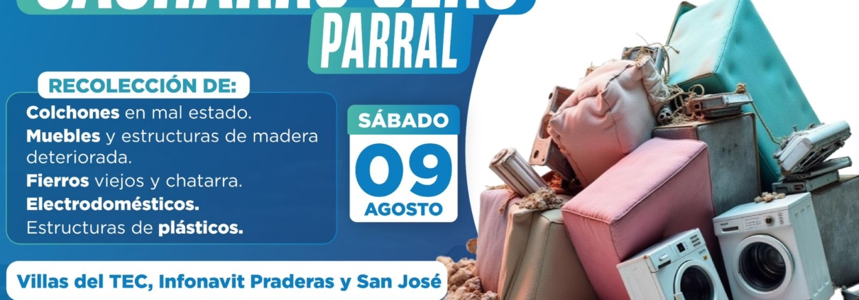 Este sábado 9 de agosto de 6:00 de la mañana a la 1:00 de la tarde se llevará a cabo la recolección de cacharros en las colonias Villas del Tec, Infonavit Praderas y San José, donde se exhorta a la ciudadanía a colaborar sacando objetos en desuso como llantas, muebles viejos, electrodomésticos y otros artículos que ya no tengan utilidad en el hogar.
