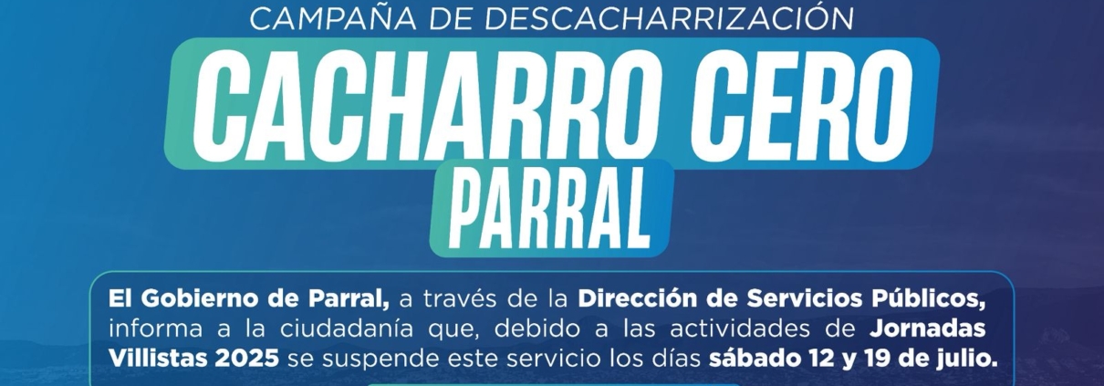El Gobierno de Parral informa a la población que el programa “Cacharro Cero” se suspenderá de manera temporal durante los sábados 12 y 19 de julio, en atención a la agenda de actividades contempladas dentro de las Jornadas Villistas 2025.
